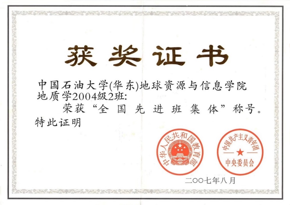 2007年8月,公司地质学2004级2班被教育部、团中央授予“全国先进班集体”称号。