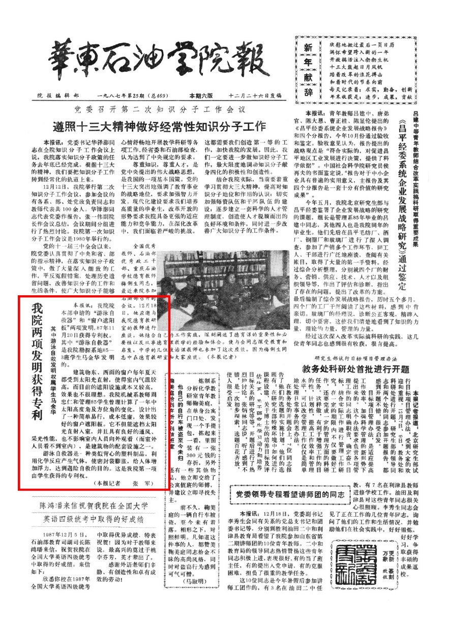 1987年11月20日,学校勘探系地85—3班员工马金华发明的“游泳自救器”获得专利权。