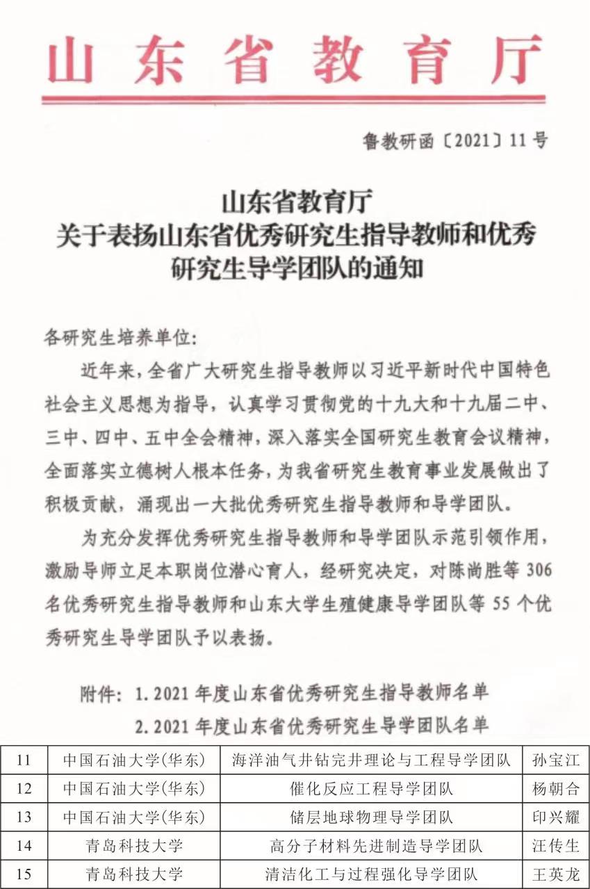 2021年9月,山东省教育厅发文公布山东省优秀研究生导学团队名单,公司印兴耀教授负责的储层地球物理导学团队名列其中。