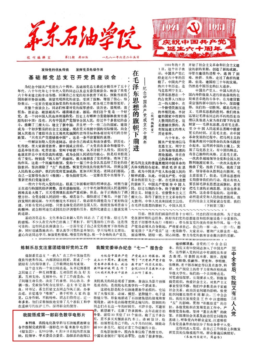 1981年6月,学校电化教学科与石油地质教研室合作摄制完成的第一部彩色35毫米教学电影片《储集层》在校内首次放映。