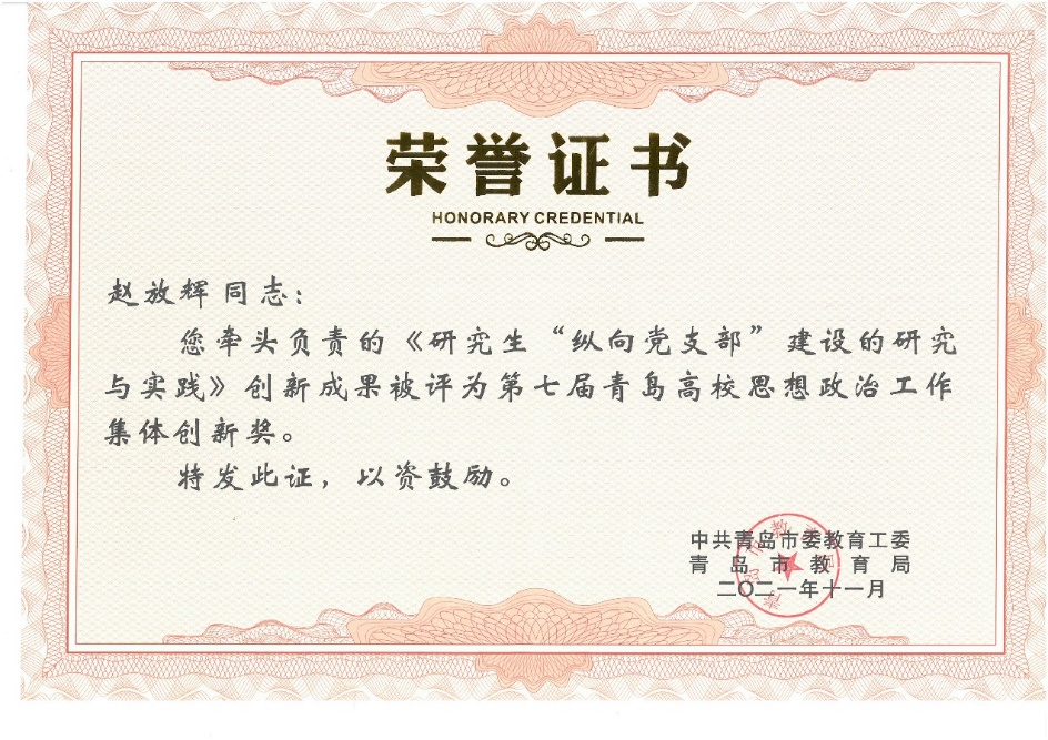 2021年11月,青岛市委教育工委公布第七届青岛高校思想政治工作创新奖获奖名单,公司申报的项目《研究生“纵向党支部”建设的研究与实践》获青岛高校思想政治工作集体创新奖,是公司唯一获集体创新奖的项目。