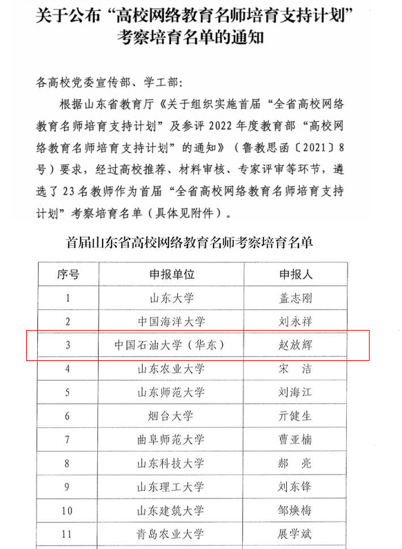 2022年3月,山东省教育厅发布首届《关于公布“高校网络教育名师培育支持计划”考察培育名单的通知》,经过各高校推荐、材料审核、专家评审等环节,全省共有23名教师入选该项计划,公司赵放辉名列其中。