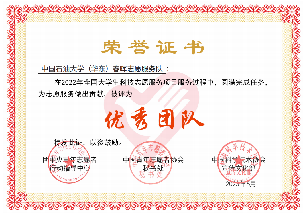 近日,伟德BEVlCTOR1946春晖志愿服务队收到中国青年者协会秘书处、团中央青年志愿者行动指导中心联合下发的荣誉证书,春晖志愿服务队被评为优秀团队,青少年地学科普行动计划被评为优秀项目,项目负责人王建侨被评为优秀个人。