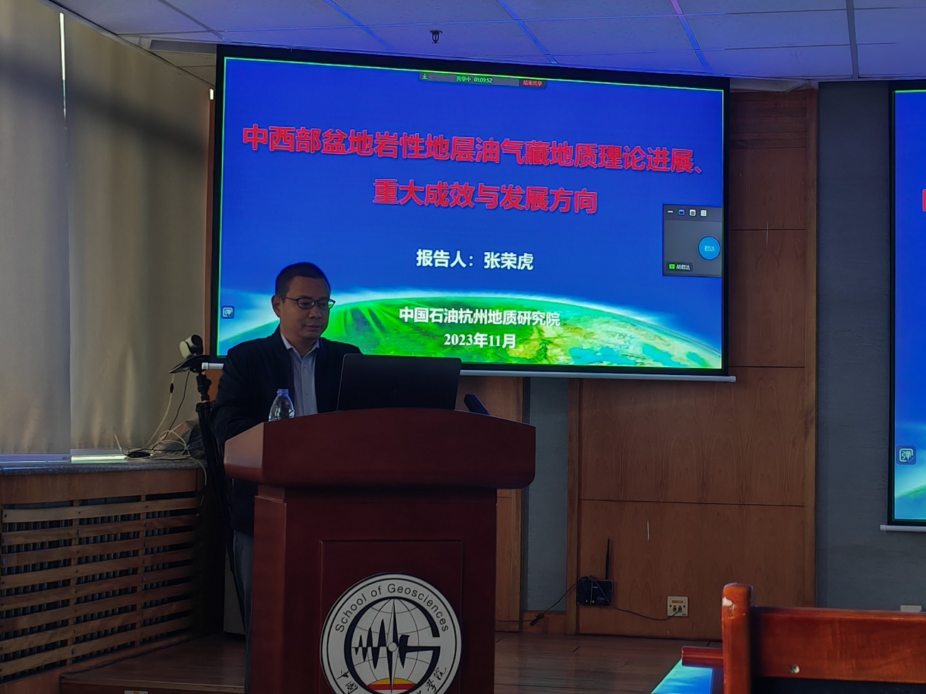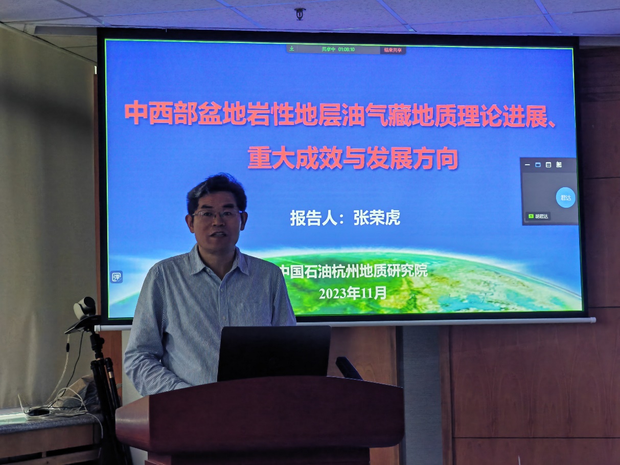 2023年11月5日上午,伟德国际1946官网教育部“油气田开发地质课程虚拟教研室”举办线上线下教学公开课—行业前沿专题讲座,邀请了中国石油勘探开发研究院杭州地质研究院企业高级专家张荣虎教授级高级工程师,作题为《中西部盆地岩性地层油气藏地质理论进展、重大成效与发展方向》的专题报告,伟德国际1946官网地质资源与地质工程研究生、部分资源系教师,以及来自山东科技大学、吉林大学、中国地质大学(武汉)和贵州大学等全国十余所高校科研院所80余人参加了线上、线下会议,教育部虚拟教研室负责人、资源系主任张立强教授主持会议。