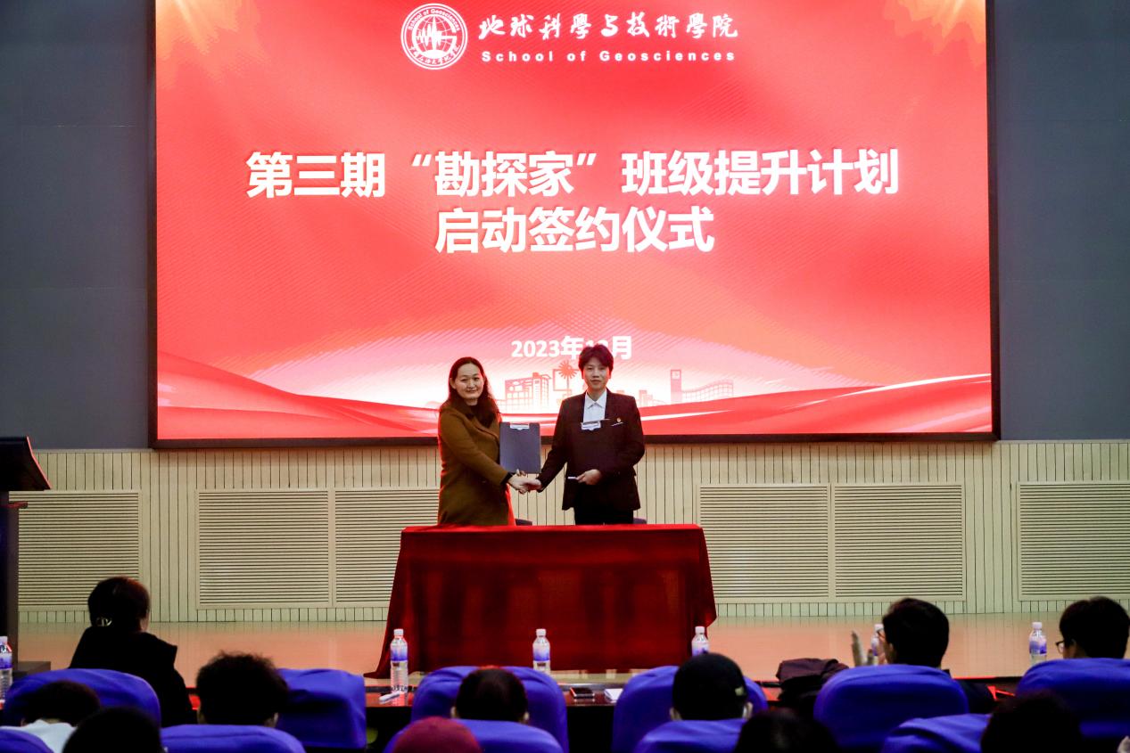 为有力推进学院学风建设,发挥优良学风班级在学风建设中的主体作用,郑珊珊与代表班级地物2101班、本研地学2201班签订“勘探家”班级提升计划任务书,任务书对班级发展和思路举措提供了目标和遵循。