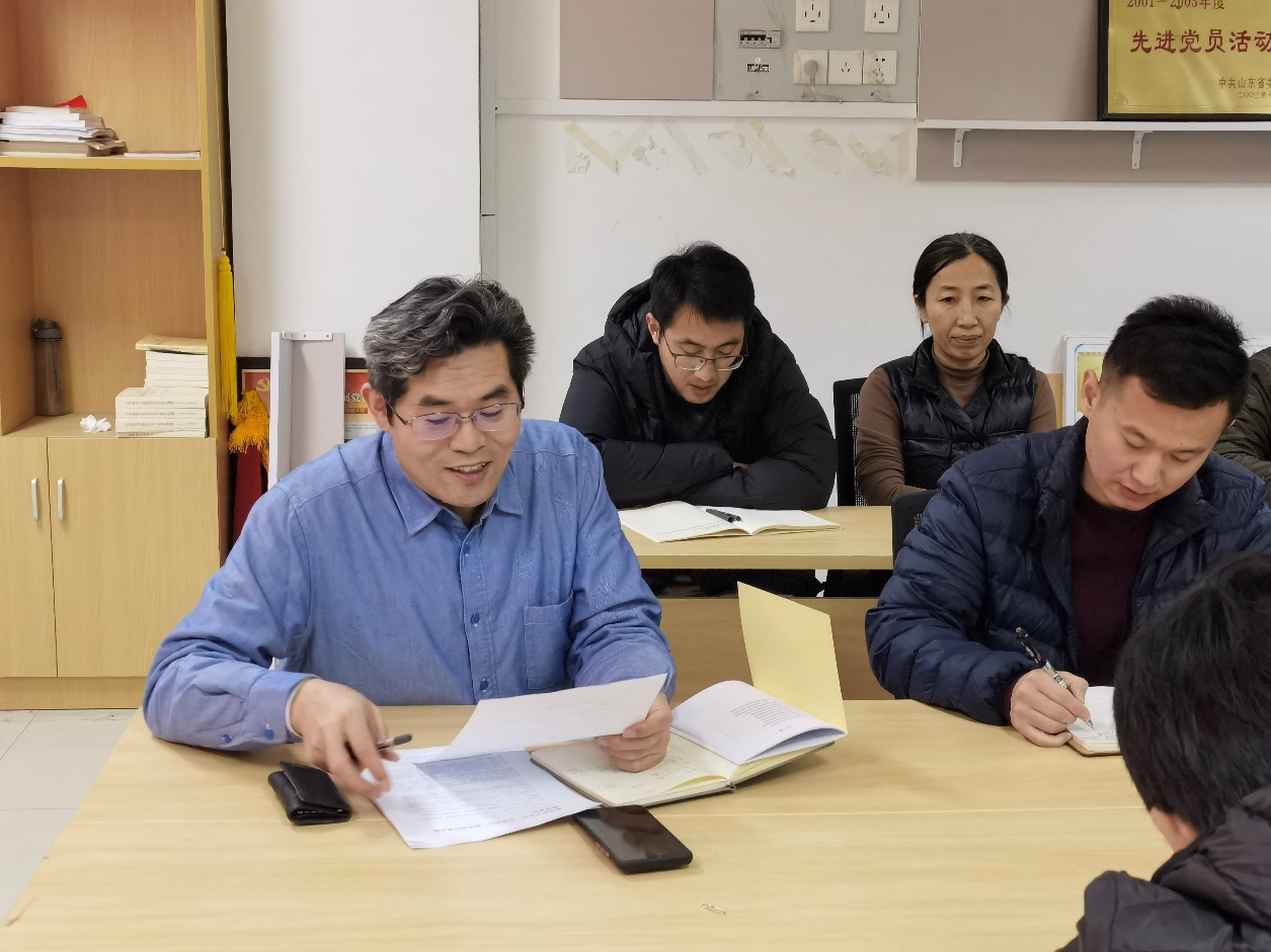 张立强教授首先向参会党员介绍了资源系党支部入选山东省“双带头人”教师党支部、以及党支部建设规划情况。然后,结合12月份支部的学习活动,带领参会党员集体学习新华社评论员文章——《不忘初心,坚守共产党人的精神家园》,该文章评述了关于“牧民省长”尕布龙的平凡而伟大的一生,教育广大党员行动是最有力的证明,奉献是最朴实的语言,坚守共产党人的精神家园,就要心中有党,始终用行动诠释对党的忠诚;坚守共产党人的精神家园,就要心中有民,始终把人民放在心中最高位置;坚守共产党人的精神家园,就要心中有责,始终把责任扛在肩上。张立强表示,作为高公司党员教师,要做到心中有员工,做好教书育人的本职工作。随后,张立强教授重点介绍了“双带头人”工作室建设任务,包括强化党支部政治功能、抓好党建主责主业、提升思想政治工作质量、促进学校事业发展和加强党支部班子建设。