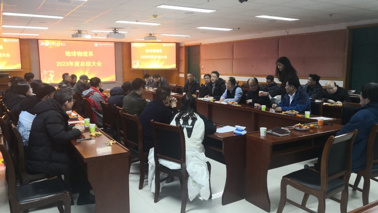 2023年12月29日下午,在新年即将到来之际,地球物理系全体教师在C座757举行2023年度工作总结会和2024年新春茶话会,部分在青退休教师受邀参加,经理宗兆云出席会议并发表讲话。会上每位在职教师对自己一年来在教学、科研、员工培养、社会服务等方面的工作情况进行了详细的介绍,之后对各位老师进行了年度工作考核和师德师风考核。系主任曹丹平教授与支部书记张凯分别对地球物理系行政工作与党支部工作向全系教师和退休教师进行了汇报。