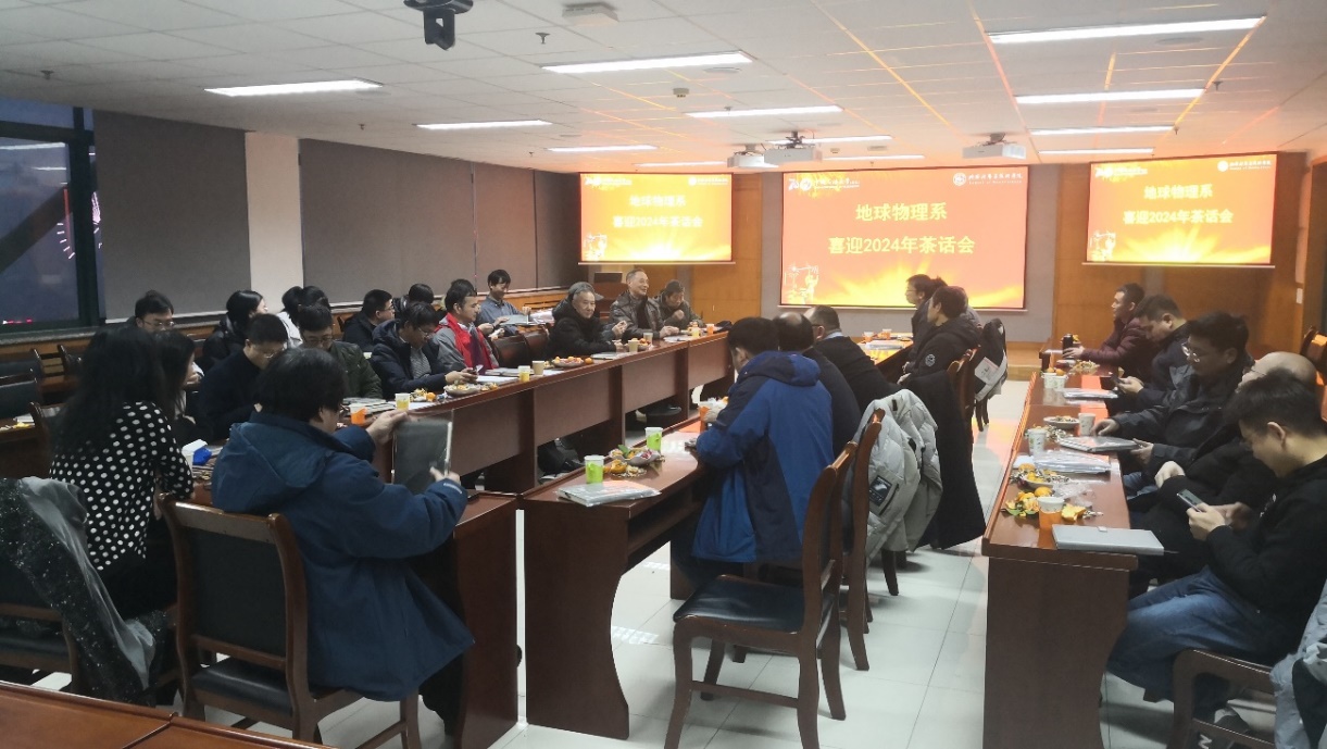 地球物理系每年的迎新茶话会都会邀请退休老教师参加。今年,王永刚、刘展、周家慧、张传德四位老师参加茶话会。会上,王永刚教授代表退休教师发言。王老师回顾了从上世纪九十年代到新时代,地球物理系近30年从低谷到辉煌的发展历程,对地球物理系在近些年取得的突出成绩感到由衷的高兴,并对近几年加入地球物理系的青年教师寄予殷切希望。经理宗兆云教授对地球物理系教师在2023年度的工作成绩高度肯定,展望即将到来的2024年,希望各位教师牢记老教师们的殷殷嘱托,凝心聚力谋发展、砥砺前行谱新篇,坚守立德树人根本任务,助力地球物理系和学院事业发展再上新台阶。