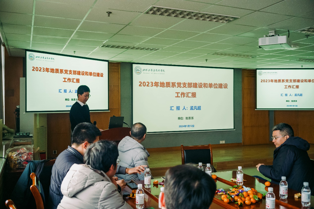 随后,党支部书记孟凡超教授向全系教师汇报了地质系2023年度的党支部和单位建设工作。2023年地质系党支部继续巩固全国样板党支部建设成果,组织多次主题党日活动,创新党员实践教学方式;获批公司党委重点党建课题1项,入选省级课程思政示范课程1项;入选山东省本科高校黄河重大国家战略课程思政优秀案例1项;吸收正式党员1人;初步建成小黄山地质公园,助力科左后旗扶贫工作,成功举办第十七届全国古地理学及沉积学学术会议;强化本科生导师1+2政策,推动实践思政落地,积极参与学校和学院工会活动,并取得优异成绩。