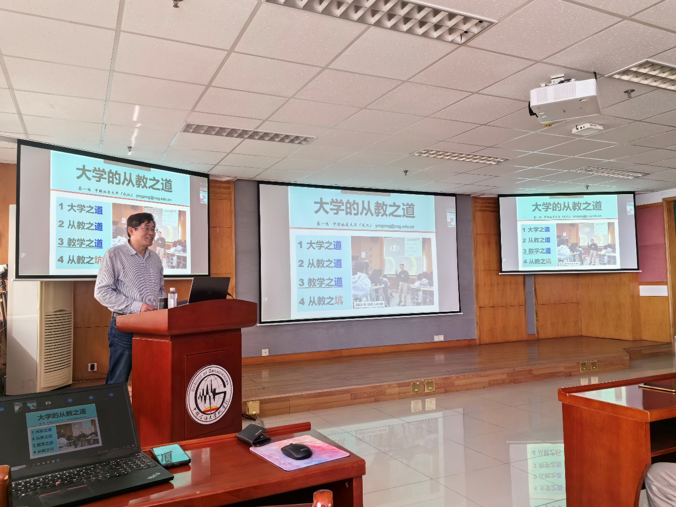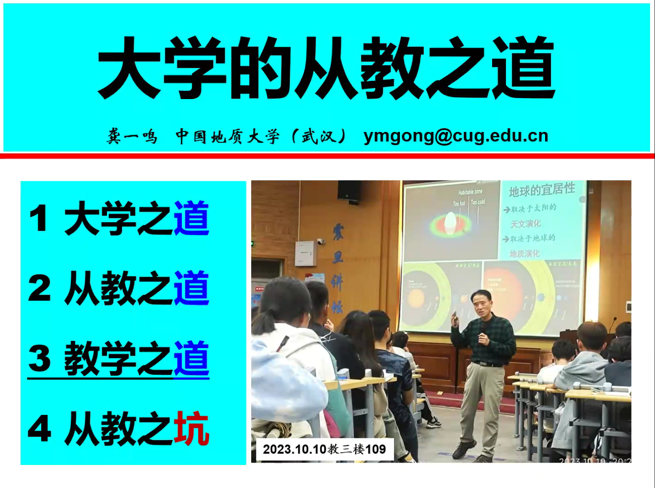 结合多年的教学科研经验,龚一鸣教授从大学之道、从教之道、教学之道和从教之坑等4个方面系统深入阐明了大学从教之道的内涵和本质。他首先介绍了大学之道的含义,他引用了孔门弟子曾子所作的《大学》的内容,即真善美、止于至,包含明明德和亲民两方面,包括格物、格知、诚意、正心、修身、齐家、治国和平天下等内容。随后,他从爱道、研道和学道三方面阐述从教之道的内涵:即爱道,热爱从教事业的原因包括职业之基、事业之本、家国之需、员工之盼;其次为研道,龚教授认为,教学与科研关系的理想呈现为莫比乌斯带,在上好课、育好人的同时与科研创新相辅相成;最后是学道,其内涵依次分为:为人之道,晓做人之理、学为事之道,明做事事之要、学为学之道,奠学养之基和学为师之道,铭育人之本。