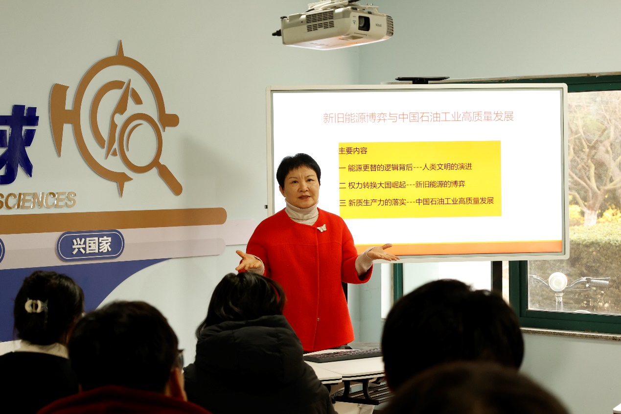 解晓燕从“能源更替的逻辑背后—人类文明的演进”“权力转换大国崛起—新旧能源的博弈”“新质生产力的落实—中国石油工业高质量发展”等三个方面进行讲解。她运用大量生动的案例、图标总结了人类使用能源的不同发展时期,归纳了能源形式的更替的特点。她认为,应该树立多维立体的能源发展观,不能单一、片面地看待能源转型和新旧能源博弈。在相当长的一段时间里,传统能源依旧会充当经济发展的“压舱石”和“稳定器”,特别是在面临地缘政治冲突等突发性事件发生时,传统能源的稀缺性会更加凸显。从柴草时期到蒸汽机时期,从煤炭时期到电力时期,再到石油时期,她对每个阶段的能源变化与权利转换的相关性进行了详细阐述,特别是美国“石油美元”霸权的建立过程。她表示,每一次能源革命都将带来一场深刻的世界格局大洗牌,而每一次工业革命的本质就是能源革命,在能源技术无法突破的前提下,任何先进工业,只是不切实际的幻想。在谈到“新质生产力落实”时,她认为,国际形势变化与国内高质量发展对中国石油工业提出了更高要求,以科技创新的突破实现新质生产力的形成和提高至关重要,也是驱动中国石油工业高质量发展的关键所在。