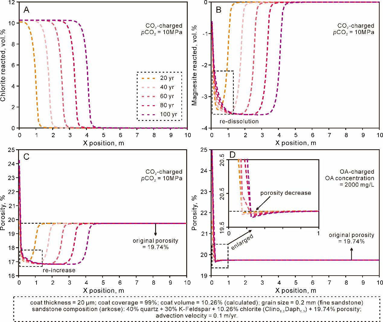 图2. 两种酸性流体所产生的反应运输数值模拟结果:A和B显示CO2案例的绿泥石膜溶蚀和次生矿物沉淀;C和D显示两种酸性流体所导致的砂岩孔隙度变化。