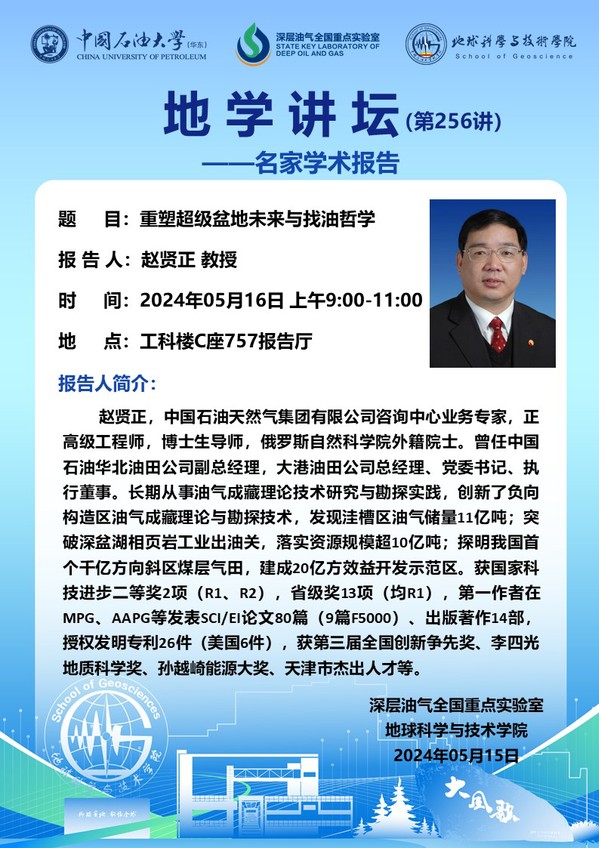 【地学讲坛第256讲】关于赵贤正教授《重塑超级盆地未来与找油哲学》学术报告的通知
