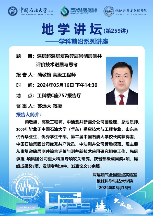 【地学讲坛第259讲】关于蔺敬旗 《深层超深层复杂碎屑岩储层测井评价技术进展与思考》学术报告的通知