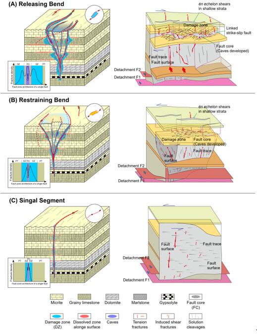 图2. 走滑断裂张扭和压扭叠置区及直立段内部结构及流体运移模型