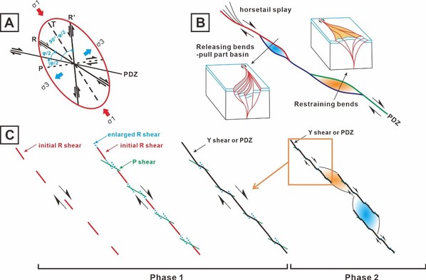 针对上述问题,该项工作以塔里木盆地顺北地区为研究区,系统开展了构造精细解释、地球化学、数值模拟等研究,主要取得了以下成果:走滑断裂的形成是两个阶段“生长-连接”作用的结果,第一阶段为剪切作用形成的破裂逐渐扩大并发生连接,形成各个独立断层分段;第二阶段为不同分段的互相叠置,以形成张扭和压扭叠置区的形式持续扩大断裂规模。这种“生长-连接”过程在顺北地区经历三个时期,包括加里东早期初始破裂发育期、加里东中期强烈发育连接期和加里东晚期-海西期弱活动期。受复杂形成过程影响,走滑断裂产生多变的内部结构,对于不同的叠置区,断裂内部结构差异较大。在分析岩性、断裂组合、裂缝发育等特征的基础上,构建了张扭和压扭叠置区以及直立段三类走滑断裂内部结构模型。走滑断裂是流体运移的重要通道,断裂内部结构对流体的运移行为具有重要影响,地球化学的证据表明,碳酸盐岩发育区断层核比破碎带可能更容易受到流体的强烈作用而出现溶蚀孔洞,表现为断层核的元素更易于被流体迁移。根据三类走滑断裂内部结构模型,结合地球化学及数值模拟研究,形成了张扭和压扭叠置区及直立段三类流体运移模型,并出张扭叠置区具有更为优越的油气输导条件。