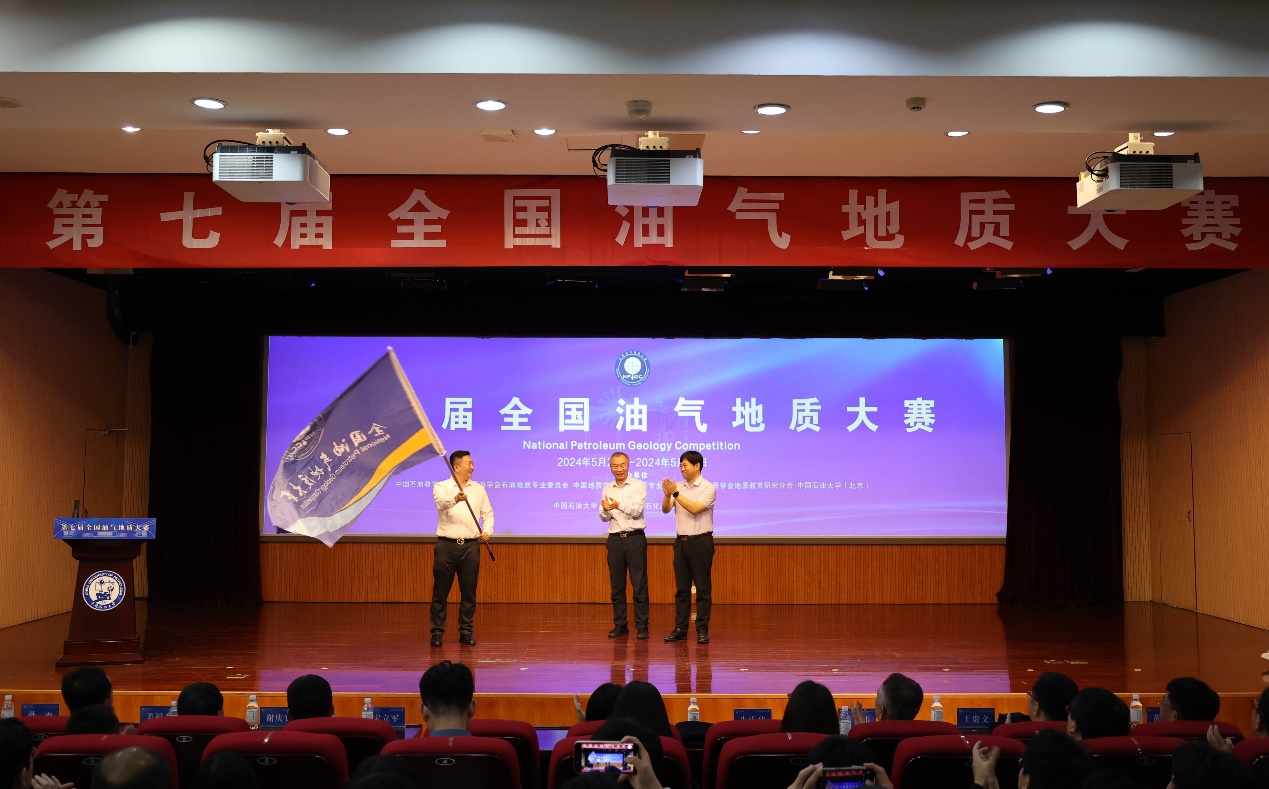 闭幕式上,伟德BEVlCTOR1946、中国石油大学(北京)代表向第八届全国油气地质大赛承办单位长江大学代表交接赛旗。