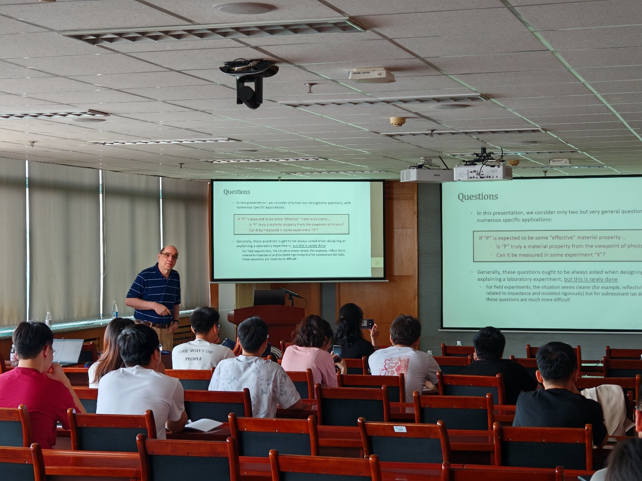 报告会上,Igor Morozov教授针对大家关心的岩石物理实验与岩石微观结构之间的相互关系,提出了两个基本问题:1)从物理的角度讲,通常使用的等效介质属性概念是否真正反应了介质的属性;2)这些等效介质属性能否通过实验观测得到?Igor Morozov教授从介质的结构属性、表象经验关系属性、力学属性以及与测量手段(装置、样品大小、测样流程等)相关的属性等三个方面对以上两个基本问题进行了分析,最后对经验属性和本征属性进行了分类,回答了“Which can” 和 “which cannot”的问题。在报告过程中与Muller教授进行了交流讨论,解答了员工们的疑惑。