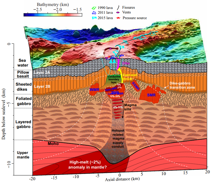 岩浆系统的结构和动力学过程在火山喷发和演化中起着根本性的作用。然而,在大多数活火山系统中,地壳岩浆库和输运管道很难进行精确成像。本论文针对Juan De Fuca洋中脊轴向海底火山岩浆系统成像不清问题(图1),利用多参数全波形反演方法获得了火山口下方的高分辨率纵波速度、衰减模型、温度场以及部分熔融模型。查明了上地壳多个岩浆囊的空间分布情况,并在火山口西侧发现了一个新的岩浆库。研究表明,主岩浆库上层的最大熔融分数约为15-32%,其他部分约为10%至26%。此外,在主岩浆库下方有一个熔融分数约为4-11%的岩浆输送通道,在东部火山口下方有一个低速喉道,将主岩浆囊与海底喷发裂缝连接起来。这些发现揭示了Juan De Fuca洋中脊轴向海底火山的非对称岩浆管道系统(图2),为1998年、2011年和2015年岩浆喷发提供了新的见解。