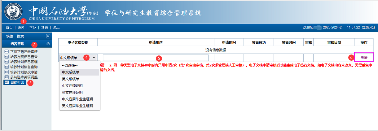 操作路径:研究生综合管理系统“培养—培养管理—自助打印”