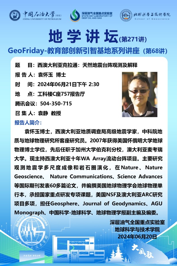【地学讲坛第271讲】关于袁怀玉博士《西澳大利亚克拉通:天然地震台阵观测及解释》学术报告的通知
