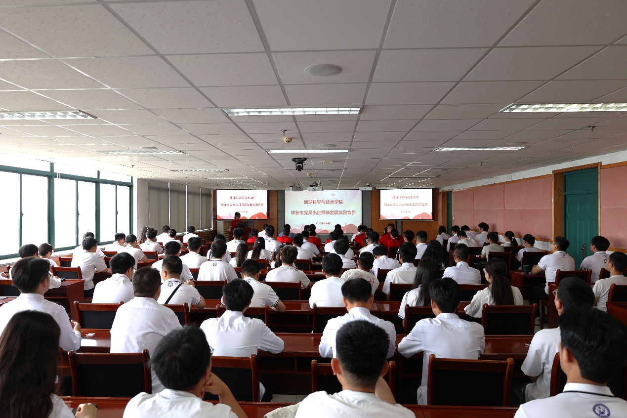 仪式现场奏响国际歌。随后,新党员进行入党宣誓,毕业生党员重温入党誓词,资源专业本科生党支部组织委员刘牧原领誓。