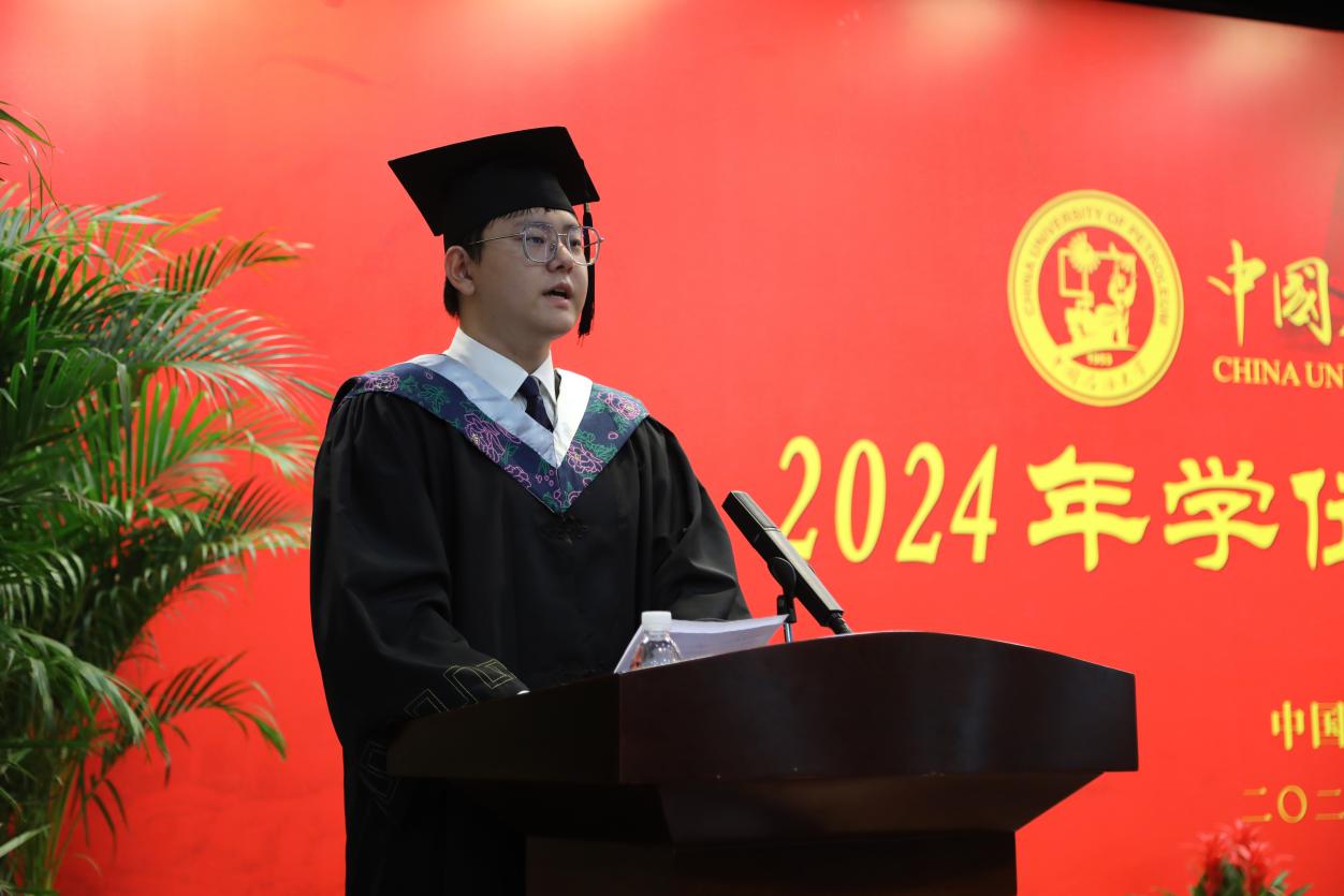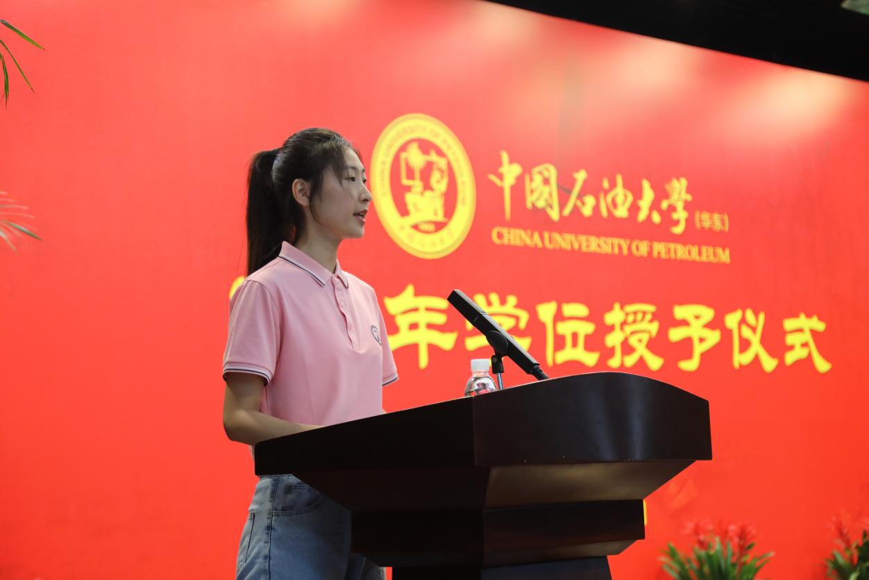 地质工程专业地物研2102班的倪雪彬作为研究生毕业生代表发言,分享了与石大和伟德国际1946官网相识、相知、相惜的美好记忆和成长感悟。她表示,学院“脚踏实地,胸怀全球”的院训、完善的培养体系以及良师益友驱散了她初始的不安,带给了她底气,帮助她逐渐找到目标和方向,继续扬帆起航奔赴下一段征程。