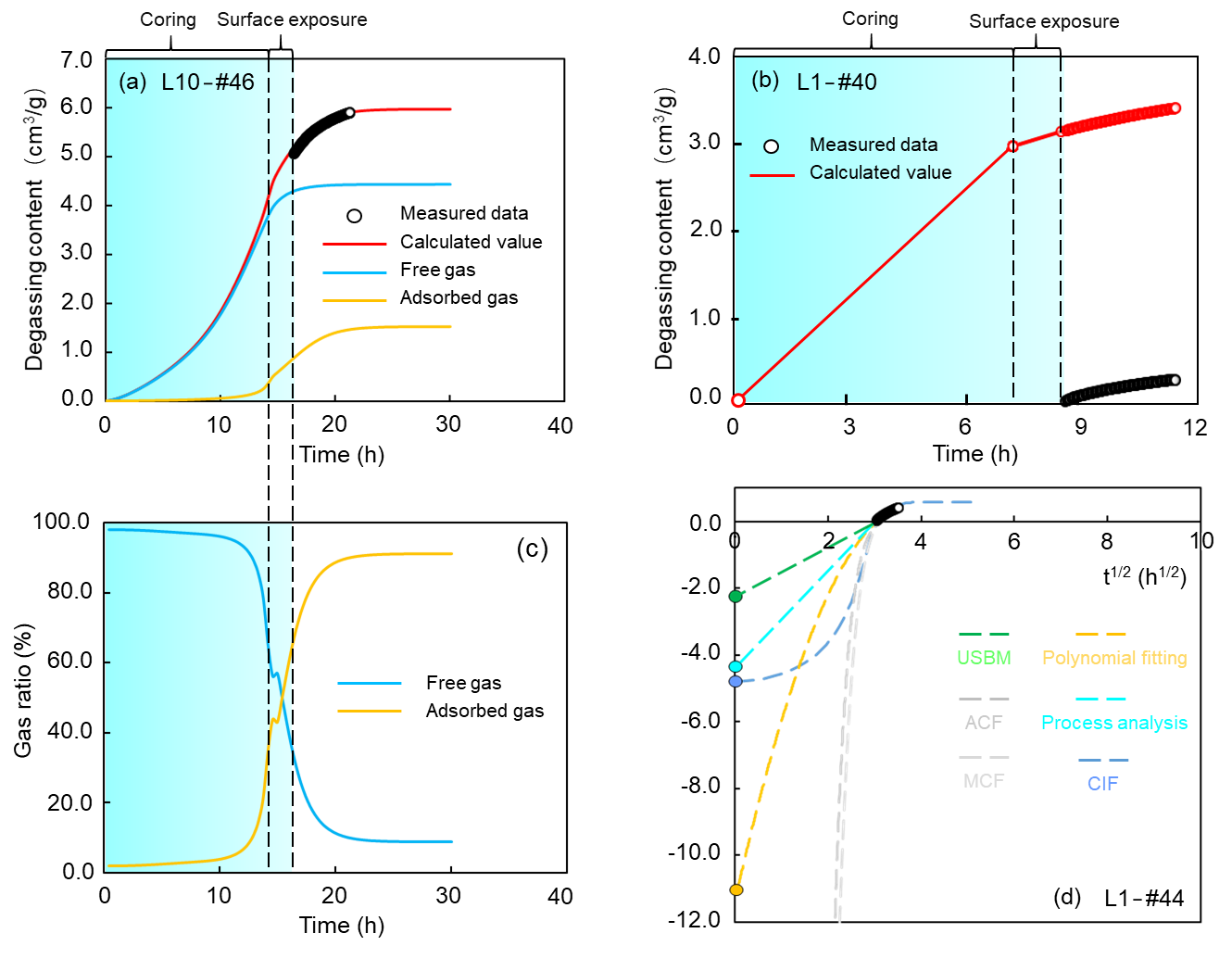 图2.(a)CIF法和(b)过程分析法评价原位含气量.(c)CIF法评价吸附气/游离气比例.(d)不同方法评价结果的对比
