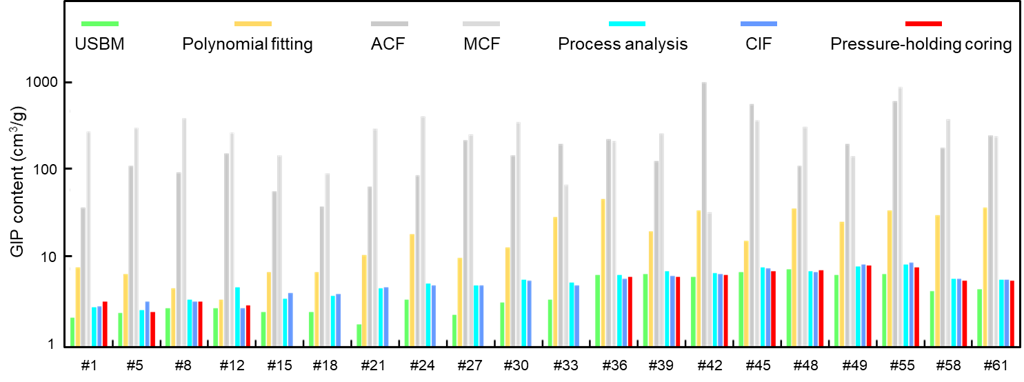 本研究选取了四川盆地泸州地区1口保压取心井的42块深层页岩样品和17口井的867块常规取心样品,开展了高压排采、常压解析和配套的室内测试分析(TOC含量、孔隙度和含水饱和度),分别采用USBM法、多项式拟合法、ACF法、MCF法、过程分析法和同位素分馏法评价了上述样品的含气性参数,并以保压取心获得的实测含气量数据作为检验标准开展了系统性的对比研究,有效揭示了深层页岩气的原位含气量和气体赋存状态特征,并分析了含气性特征对新、老方法结果的影响。