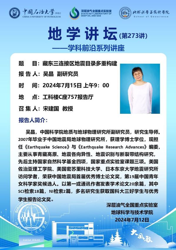 【地学讲坛第273讲】关于吴晶 副研究员《藏东三连接区地震目录多重构建》学术报告的通知