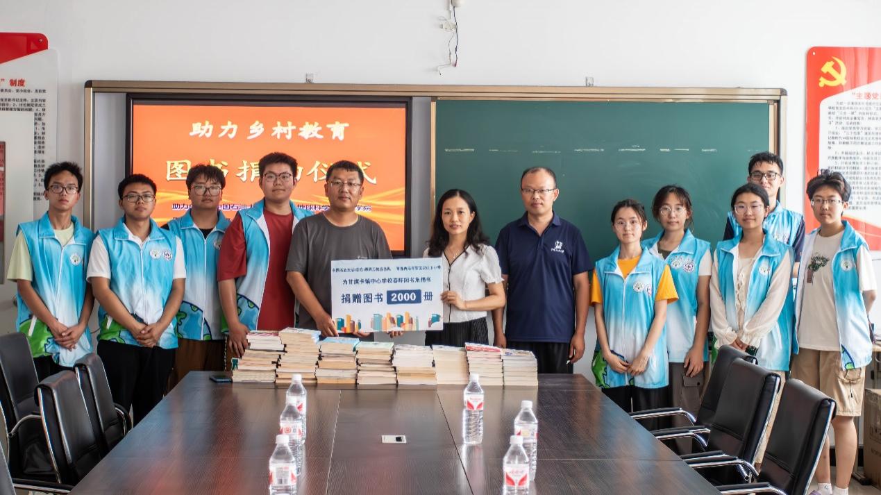 在前期的调研中,团队了解到学校的课外图书资源相对紧缺,为此,春晖志愿服务队在校内外发起图书募捐活动,共募捐图书2000册。7月31日,春晖队员在甘旗卡中心学校举办捐赠仪式,学校挂职干部、驻村第一书记李广磊,学院辅导员杨建敏与支教队员一起将募捐图书捐赠给甘旗卡镇中心学校,助力科左后旗教育发展。杨建董事长代表全校师生表达了真挚的感谢。他表示,“捐赠的2000本图书极大的帮助了公司的图书馆建设,有效的缓解了公司教育资源短缺的困境,也让公司师生感受到了贵校送来的温暖与关怀。”支教队长高晓乐将青岛市灵山卫小学员工写的明信片交递到甘旗卡镇中心学校小朋友们的手中。甘旗卡镇的孩子们也在明信片上写下了感谢话语和未来期许。通过书信对话,两校员工进行了一次跨越山海的心灵碰撞。