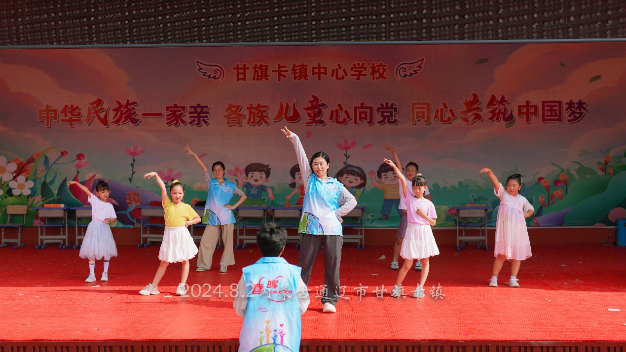 歌舞为笔,舞台作纸,助梦想启航。8月2日,一场别开生面的汇报演出为石迹队的支教之旅画上圆满的句号。舞台上,孩子们尽情展示两周的学习成果与青春风采。整齐划一的杯子舞《稻香》让人眼前一亮;精彩的魔方表演展现出速度与智慧的碰撞;激情四溢的舞蹈表演展现孩子们无限的青春活力;铿锵有力的《摘星少年》表达了少年对航天梦想的执着追求……最后,伴着离别的不舍,汇演在支教队员的合唱歌曲《这世界那么多人》的感人歌词下落下帷幕。整场演出气氛热烈,将两周的支教成果淋漓展现,赢得了家长们的阵阵掌声与热情鼓励。这场汇演不仅是对支教成果的集中展示,更是对甘旗卡的孩子们精彩未来的美好祝愿。离别时,包国豪小朋友说道,“舍不得大家,很珍惜与老师们在一起成长的时光,我以后也要勇敢去追寻属于自己的天空。”