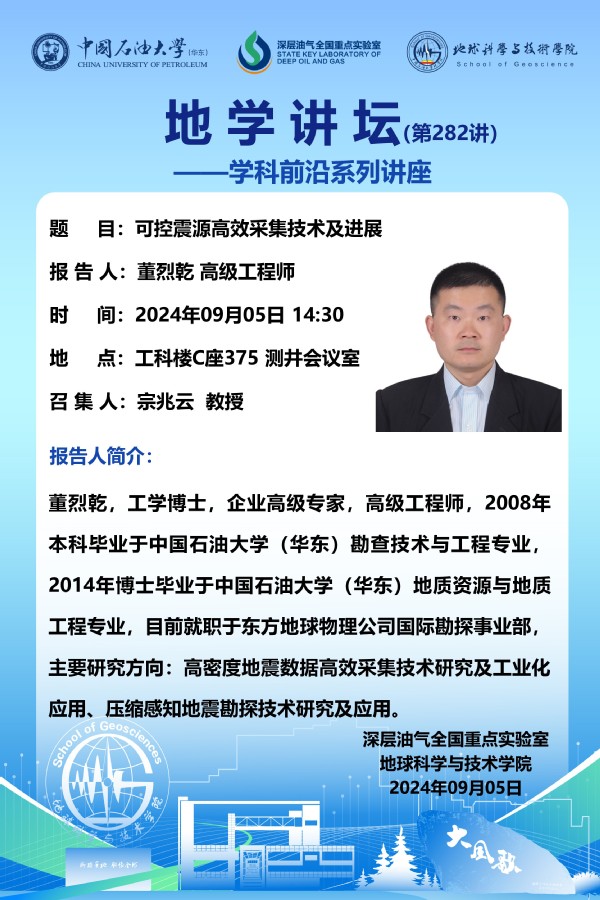 【地学讲坛第282讲】关于董烈乾 高级工程师《可控震源高效采集技术及进展》学术报告的通知