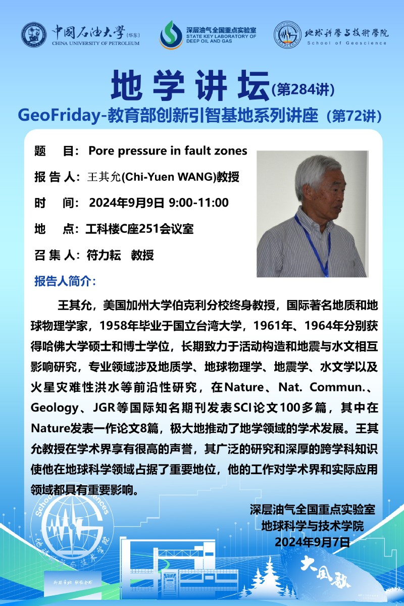 【地学讲坛第284讲】关于王其允(Chi-Yuen WANG) 教授《Pore pressure in fault zones》学术报告的通知