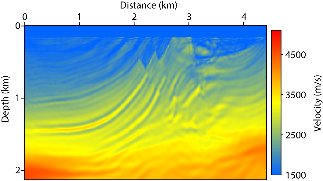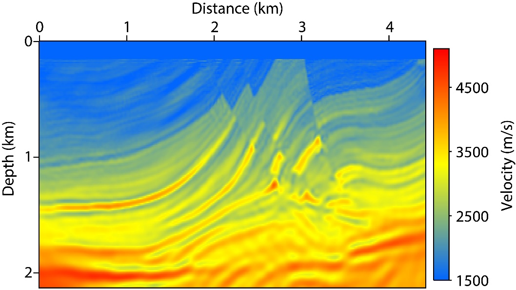众所周知,全波形反演(FWI)梯度包含层析分量和偏移分量。首先利用层析成像分量建立背景速度模型,然后利用偏移分量恢复模型接口,是FWI成功实现的关键之一。因此,有必要在FWI梯度中分离这两类组分。本文提出了一种梯度分解FWI方法(GFWI),该方法利用层析分量为FWI提供了一个良好的初始速度模型。首先基于一阶应力-速度声波方程推导出FWI梯度,然后采用加权Poynting矢量分离方法将其分解为层析分量和偏移分量。由于波场前向外推和后向外推都可以直接得到Poynting矢量,因此分离算法增加的额外计算量很小。为了更好地恢复模型的低波数部分,在早期迭代中仅使用层析成像分量进行背景速度更新,以恢复模型的低波数部分。最后,我们执行标准FWI以获得最终的反演结果。对灵敏度核测试的分析表明,所提出的梯度分解算法在分离层析和偏移分量方面是有效的。图1和图2分别显示了常规FWI和本文提出的FWI结果。在Marmousi模型上的数值算例表明,该反演方法在地震数据信噪比很低的情况下也能成功地恢复Marmousi模型的中深部结构。