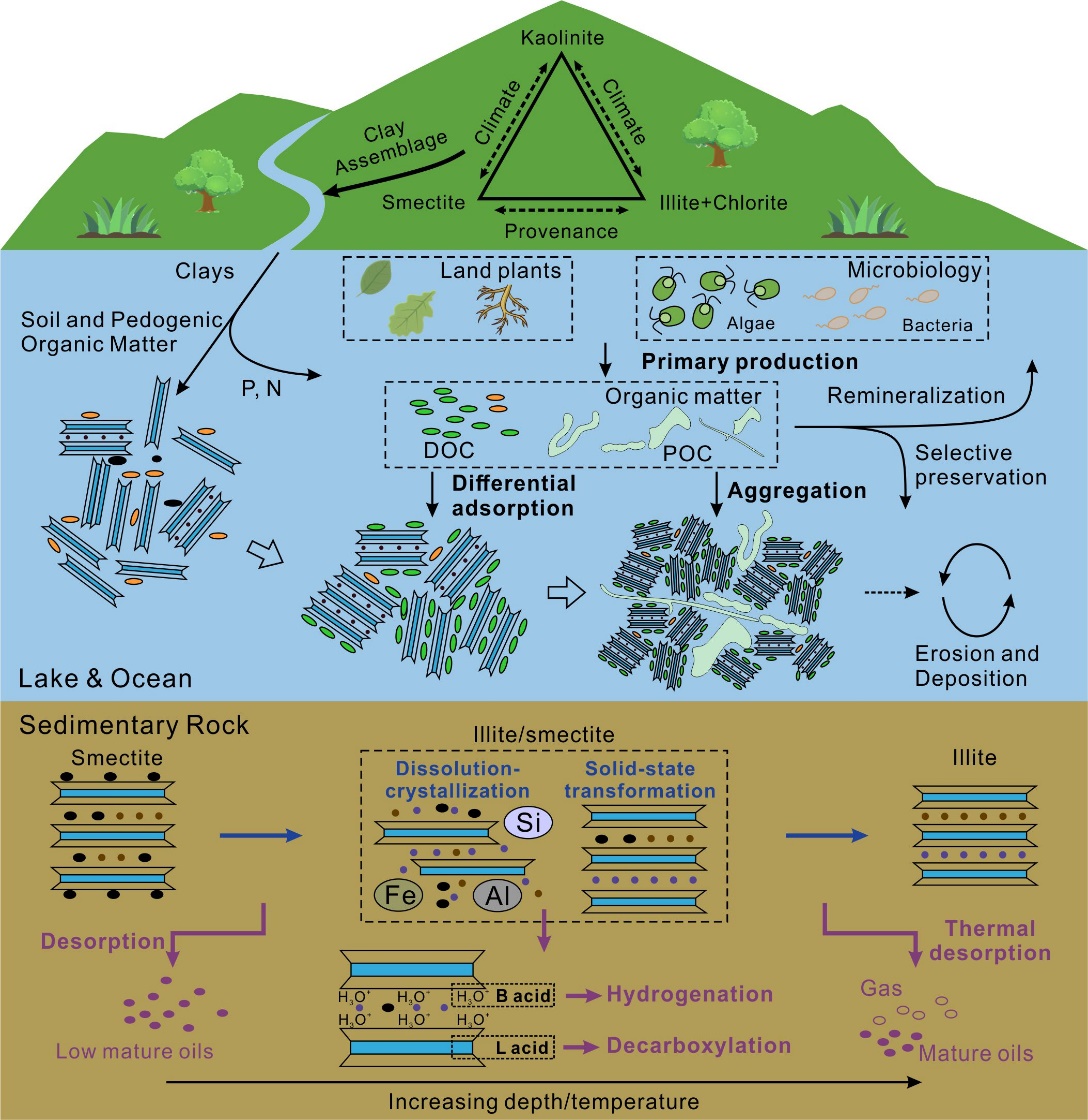 研究对有机质和粘土矿物在沉积和成岩过程中的相互作用进行了全面综述。在沉积过程中,气候和物源共同控制沉积物中的粘土矿物组成。同时,粘土矿物选择性吸附有机质,这影响了沉积物中有机质的丰度和类型。在现代海洋沉积环境中,有机质与粘土矿物的相互作用显著影响有机碳的整体活性和埋藏效率。在成岩阶段,有机质的存在极大地影响蒙脱石向伊利石的转化。反之,蒙脱石伊利石化也影响了烃类物质的生成。