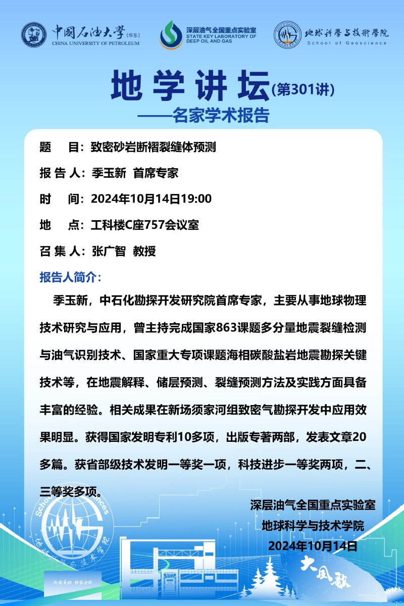 【地学讲坛第301讲】关于季玉新 首席专家《致密砂岩断褶裂缝体预测》学术报告的通知