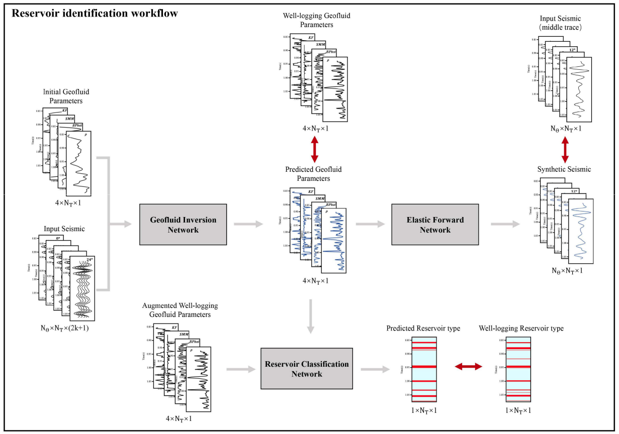 储层流体性质的准确预测是油气勘探与评价的重要环节。针对现有深度学习储层流体预测与油气识别方法受标签样本数据量限制以及地震不确定性的影响导致的储层流体识别不确定性强、稳定性差这一技术难题,本研究以深度学习算法为研究对象,以岩石物理理论、地震波传播理论为指导,结合地质先验信息,形成一种基于物理导向的半监督学习流体预测与储层识别方法。所提方法在岩石物理理论的支撑下构建“地震-流体-油气”标签样本数据集;以经典深度学习算法为基础,构建储层流体反演网络、弹性正演网络、油气识别网络;并在此基础上,通过构建物理驱动的半监督学习流体预测与油气识别协同学习架构,实现从标记数据中捕获显式物理知识的同时从大量未标记数据中挖掘隐式知识,将地球物理领域知识耦合至深度学习模型的学习过程中。实际资料应用结果表明所提方法能够有效提升储层油气识别精度。