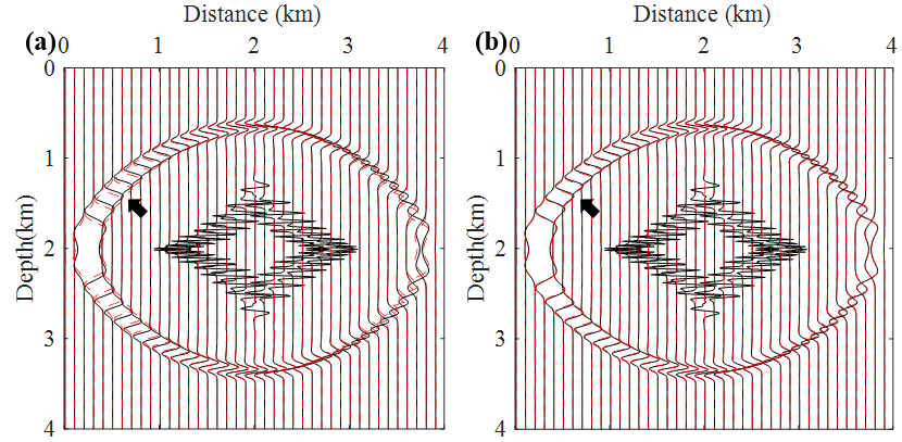 图2. 不同波动方程波场模拟对比图:(a)参考解(黑色曲线)与Mu等(2022)方法的对比图(红色曲线);(b)参考解(黑色曲线)与本文方法的对比图(红色曲线)