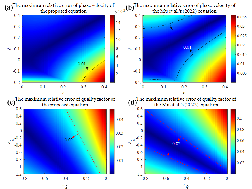 图1. 不同波动方程与精确解的最大相对误差对比图:(a)本文方法相速度最大误差图;(b)Mu等(2022)方法相速度最大误差图;(c)本文方法品质因子最大误差图;(d)Mu等(2022)方法品质因子最大误差图