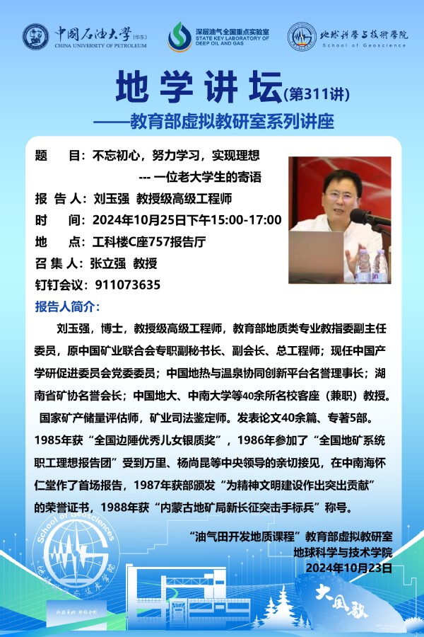 【地学讲坛第311讲】教育部虚拟教研室活动-关于刘玉强教授级高工《不忘初心,努力学习,实现理想 --- 一位老老员工的寄语》讲座的通知