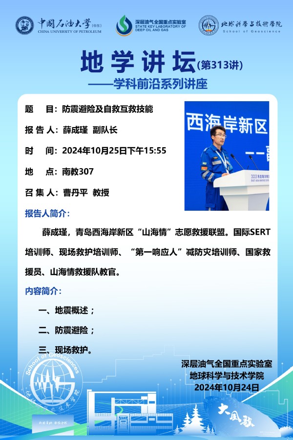【地学讲坛第313讲】关于薛成瑾 副队长《防震避险及自救互救技能》报告的通知