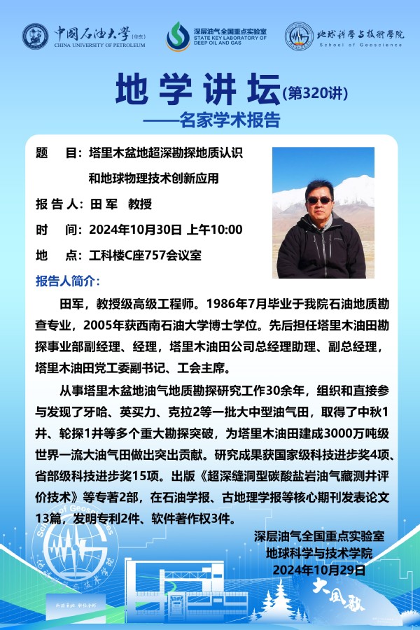 【地学讲坛第320讲】关于田 军 教授《塔里木盆地超深勘探地质认识和地球物理技术创新应用》学术报告的通知