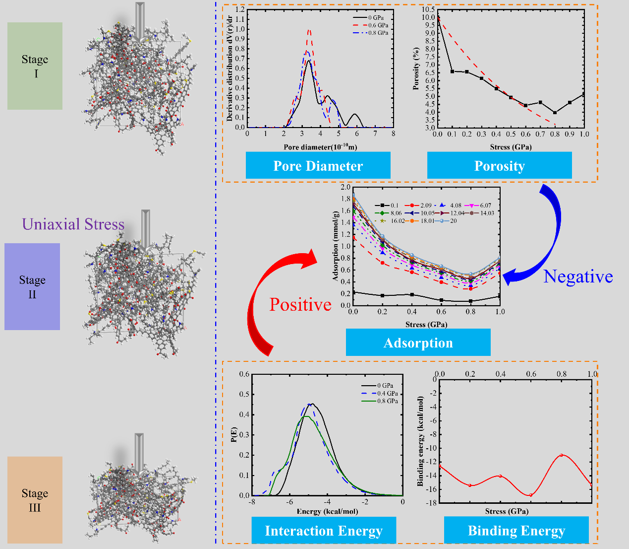 研究结果表明,随着外部应力的增大,有机质基质密度逐渐增大,孔隙率呈现负指数函数衰减趋势,在0.8GPa时达到最小值。孔隙结构随外部应力的变化可以分为三个阶段。应力的变化不仅会引起吸附空间减少,也会导致吸附位点增多,两者对CH4在有机质基质中的吸附贡献相反,即吸附空间减少对甲烷的吸附产生的负面影响大于吸附位点增多所带来的正面影响,从而导致有机质中的吸附量降低。在0.8GPa和1GPa时甲烷最大吸附量分别比初始模型降低了70%和58%。
