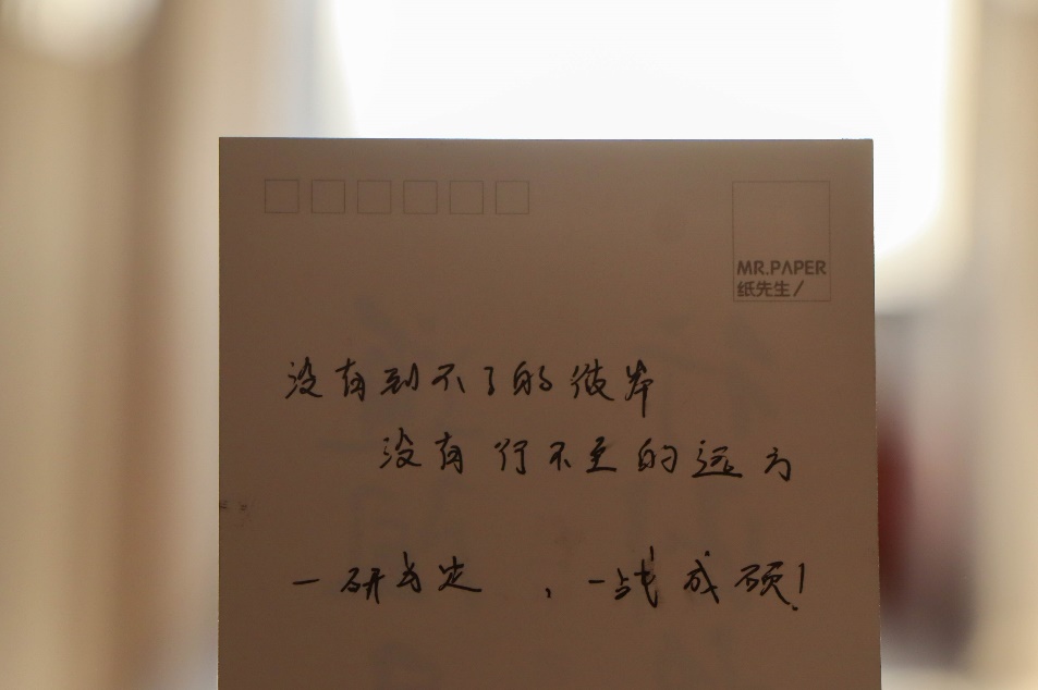 公司为2021级考研学子准备了“上岸福袋”,并为每一位学子都写下祝福和鼓励的贺卡。“没有到不了的彼岸、没有行不至的远方”、“道阻且长、行则将至”……一句句美好的祝愿,表达了伟德国际1946官网全体师生的美好祝福。郑珊珊鼓励各位考研学子,“在考研冲刺阶段一定要坚定信心,坚持到底,跑好‘最后一公里’,以最好的心态和最好的状态迎接考试。学院永远是大家的坚强后盾,希望同学们学有所成,圆梦考研。”