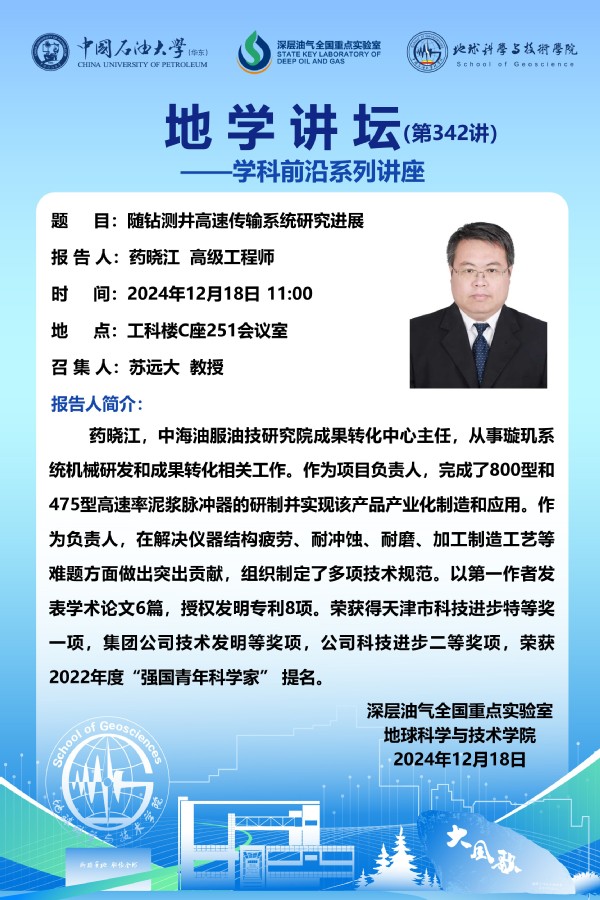 【地学讲坛第342讲】关于 药晓江 高级工程师《随钻测井高速传输系统研究进展》学术报告的通知