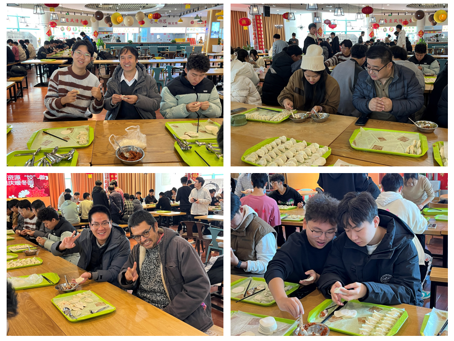 为了喜迎新年,营造良好的师生氛围,1222日,由资源系师生精心策划,以“冬至瑞至,资源‘饺’傲为主题的包饺子活动在荟萃餐厅三楼温馨开展,本次活动由资源2401班、资源2402班、资源2403班、资源2404班和本研地学2401班联合举办,资源系在校教师、班主任、2024级辅导员和全体同学参加。