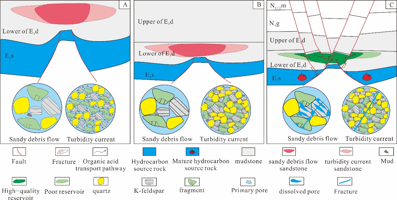 图2. 渤海地区东营组优质湖底扇储层形成过程示意图