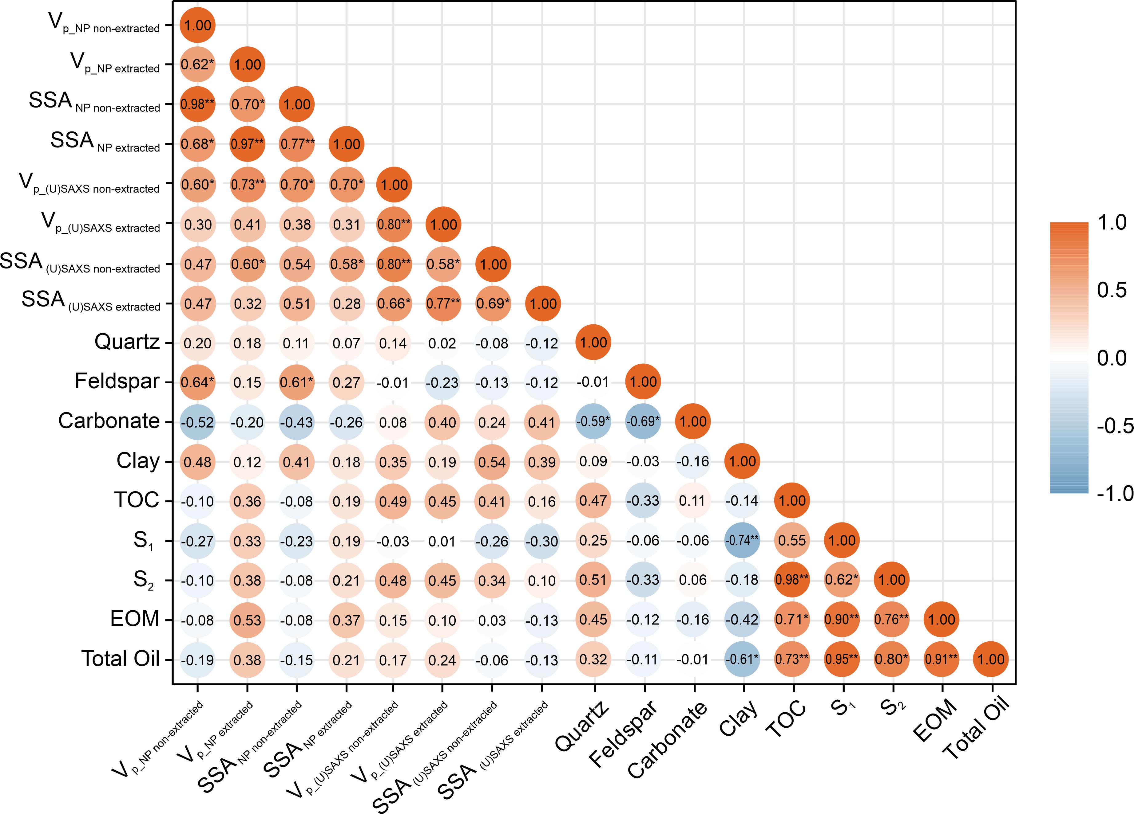 图3 孔隙结构参数与页岩组分和有机质参数的相关矩阵