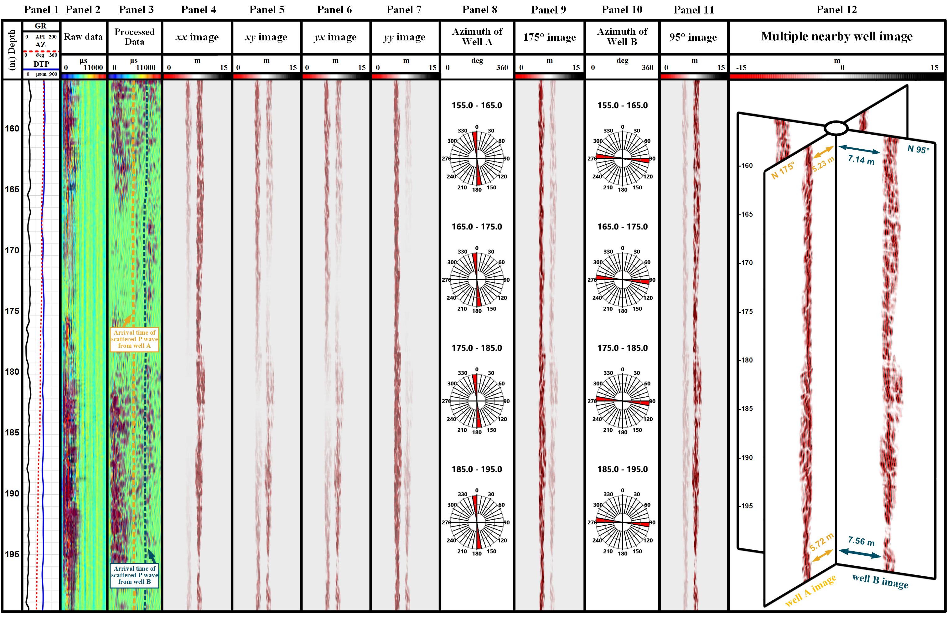 近年来,丛式井在海上油气田开发中广泛应用,油气勘探开发领域对钻井防碰的关注度逐年增高。虽然声波远探测在邻井探测中的成功应用使其成为一种潜在的声法测距防碰工具,但还需要进一步分析来证明其在多井探测方面的可行性。本文提出了一种多井声法测距方法,该方法使用四分量偶极测井数据对多个邻井进行方位扫描,并确定它们与测量井的距离和方位角。为此,开发了一种快速解析方法来模拟来自多个邻井的散射波,分析了四分量偶极散射波的方位敏感性。通过四分量旋转和偏移处理,将测得的散射波数据用于多井成像,确定多井的距离和方位角。现场数据应用证明了这种多井声法测距技术的有效性。